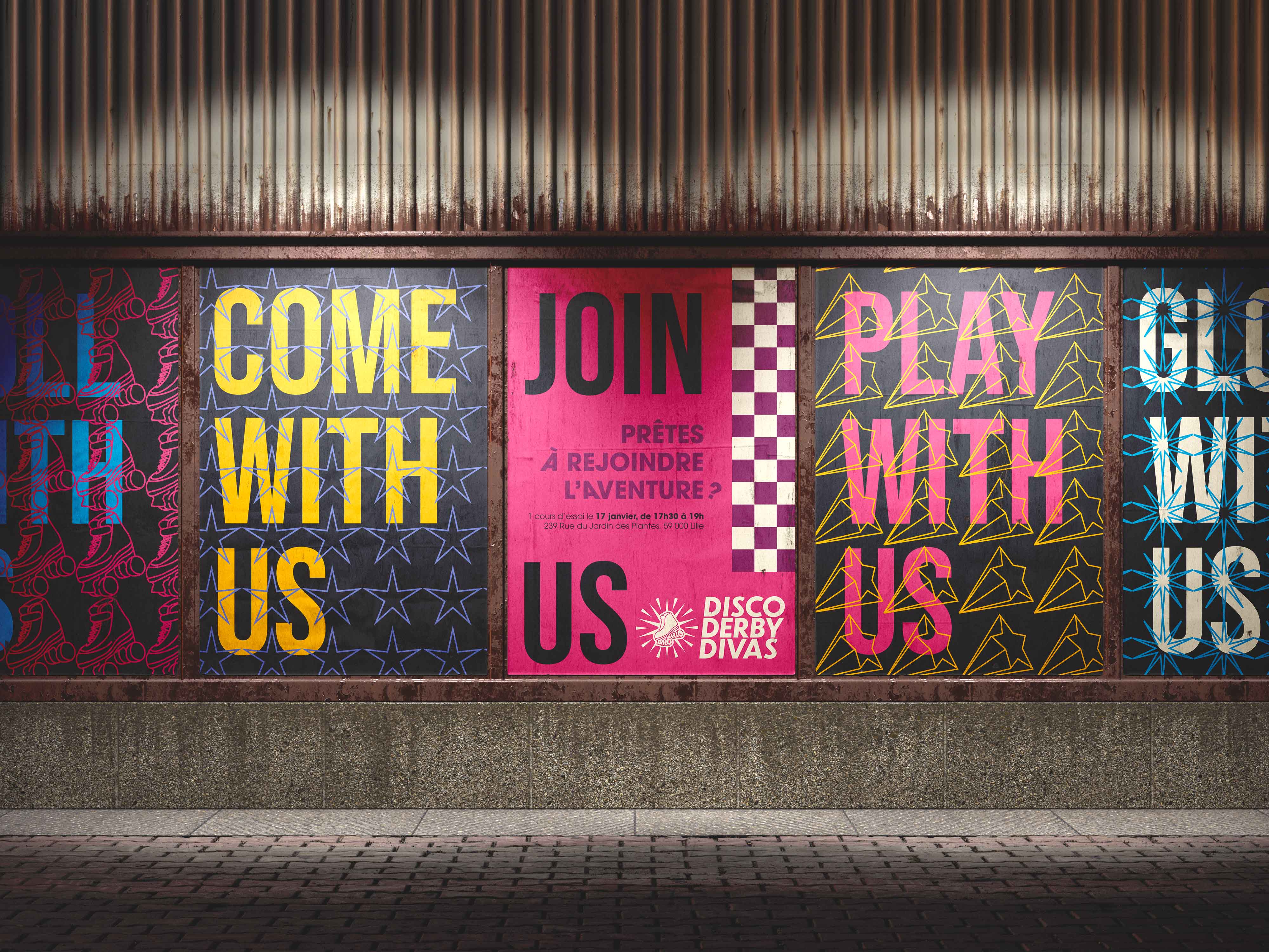 Contexte : Projet d’identité visuelle pour un club de roller derby féminin. Concept : Fusionner l’univers disco des années 70-80 avec l’intensité du roller derby pour créer une identité visuelle festive et engagée. Le naming “Disco Derby Divas” mêle énergie compétitive, glamour et esprit de sororité. Travail réalisé : Création d’un logo inspiré des boules à facettes et des étoiles, élaboration d’une palette rétro colorée, développement d’un système graphique décliné sur affiches de recrutement et visuels de saison. Le ton est inclusif, rassembleur.